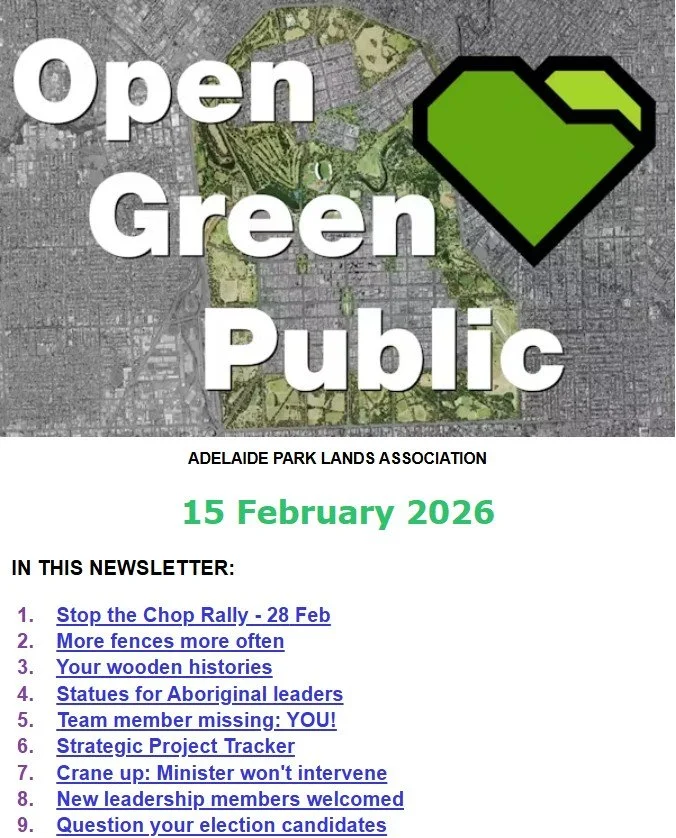 Click on the image below to read the latest newsletter “Open, Green, Public”, dated 15 February 2026.